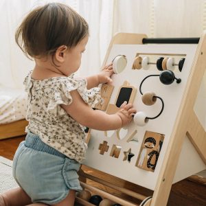 Put baby behind the wheel with our compact Beep Beep Busy Board!  Super fun activities to help junior develop small motor skills, color recognition and driving skills (just kidding). They will be delighted by the sounds of the horn while steering into the next imaginary town.  Activities include steering wheel, horn, o