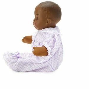 This beautiful 12" baby doll with brown eyes and brown painted hair wears a lavender and white checked knit onesie. The onesie has a yoke, gathered body, long sleeves, footed feet and a Peter Pan collar. Lavender ribbon on the front and lace trim at the wrists and on the edge of the collar complete…