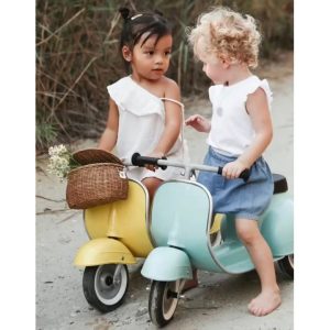 A very pretty ride on scooter in the best pink colour! A wicker basket lined with pink gingham to carry the groceries or teddy. The basket is attached with removable white tapes. Included is a set of pretty stickers! Good for pretend play. Good for social and language skills. SCOOT AND PLAY – Zoom, zoom!…
