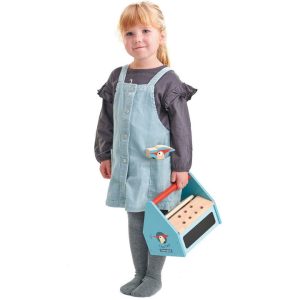A wooden toolbox containing a hammer, saw, screwdriver, drill, pair of pliers, and eight cards to line up in a neat row. Each card shows something that is broken, and the tool the 'Super Bricolo' needs to use to fix it. A highly educational role-play game. A toolbox containing all the tools for doing DIY…