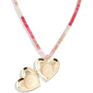 Good vibes, guaranteed! This necklace is adorned with pretty pink beads and a gold heart locket. Sparkling with pavé detailing, it’s a cheerful, eye-catching piece that adds instant joy to your everyday look.  Beaded necklace with heart shape locket Length: 16"; 3" extender. Material: Glass stones. Brass casting. Acryl