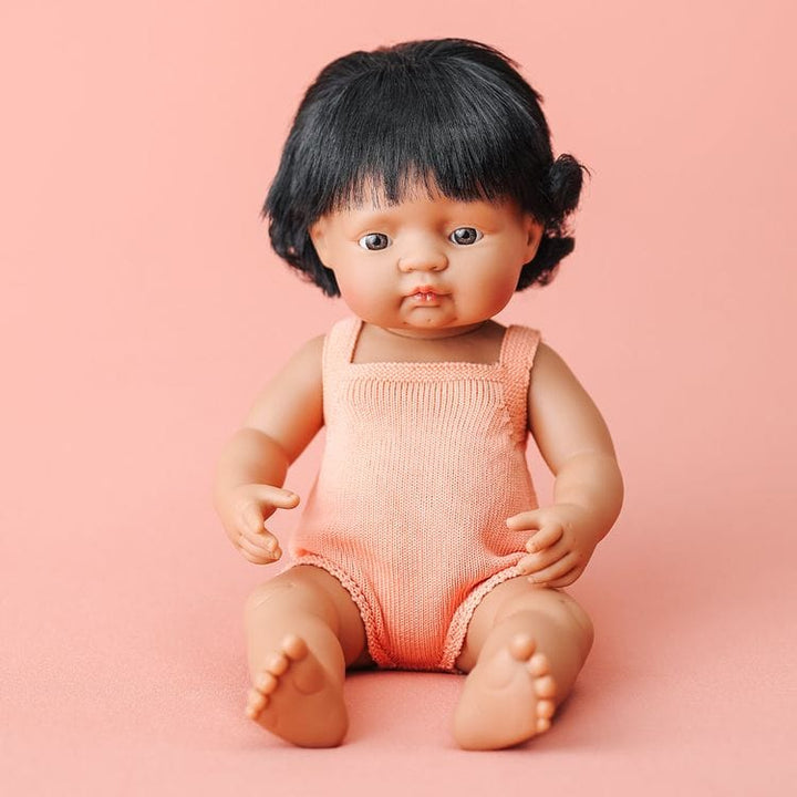How does a child feel when they see themselves represented in a toy? This doll of Latin American origin with a salmon-colored romper helps boys and girls see themselves reflected in play. Finding a friend that helps them grow, understand diversity, and learn through pretend play makes this Latin American doll a perfect