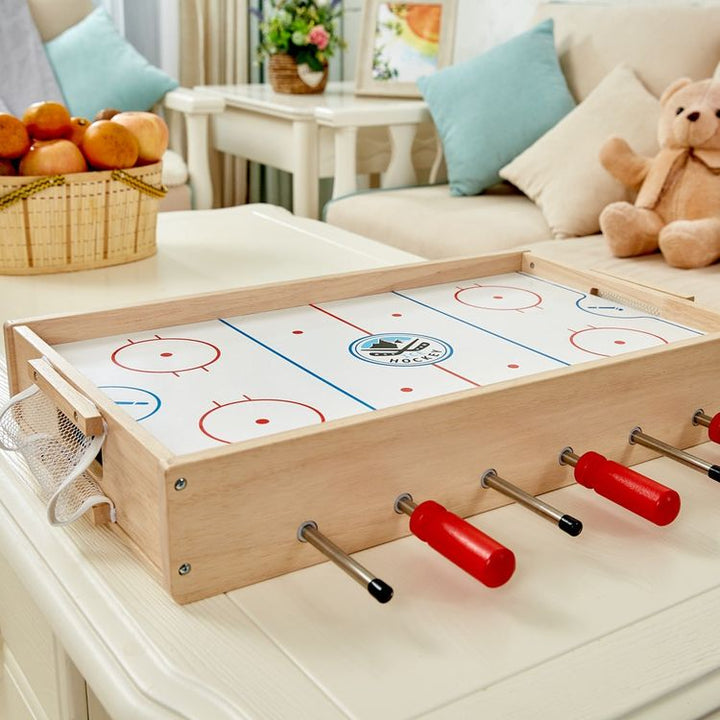Games for 2! Foosball or Ice Hockey take your pick with this 2 sided table top game designed for fun, improves fine motor skills, concentration, co-operative play and logical thought. Ages 3+ Materials: Wood, Steel Care instructions: Wipe with damp cloth, air dry; do not immerse in water PLEASE NOTE: This item is exclu