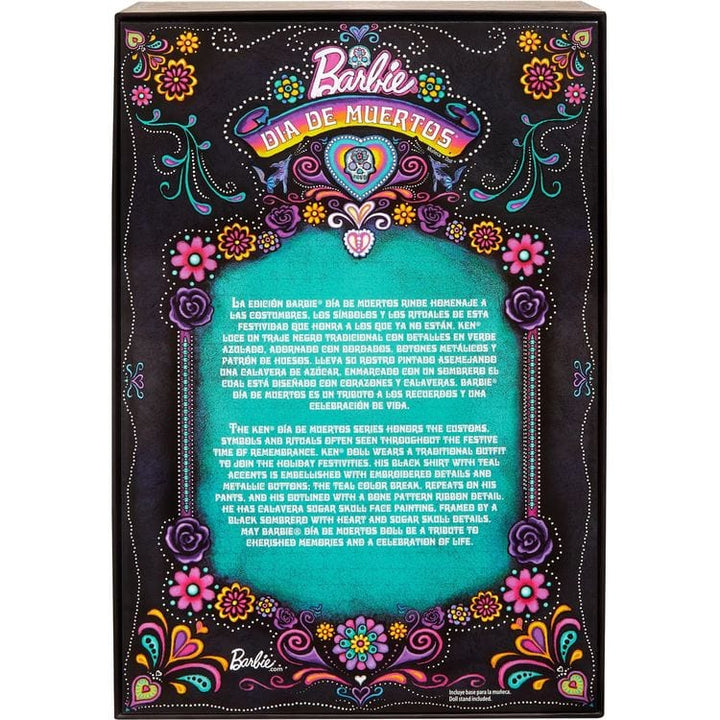 Celebrate the vibrant and beloved Mexican holiday with our 2024 DĂa de Muertos Collection. Ken doll looks striking in a black satiny suit with turquoise accents and embroidered details. He completes his look with calavera face paint, a silver belt, and a wide-brimmed sombrero. While sold separately, both Barbie and Ke