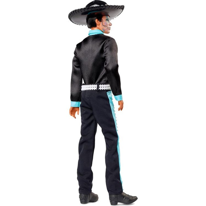 Celebrate the vibrant and beloved Mexican holiday with our 2024 DĂa de Muertos Collection. Ken doll looks striking in a black satiny suit with turquoise accents and embroidered details. He completes his look with calavera face paint, a silver belt, and a wide-brimmed sombrero. While sold separately, both Barbie and Ke