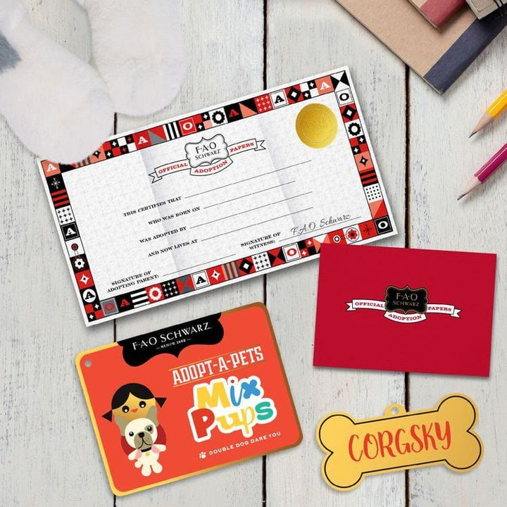 Introducing your child's new forever friend from the prestigious F.A.O. Schwarz® collection: the enchanting Mix Pups Corgsky. This 22" plush creature, an adorable blend of Siberian Husky and Corgi, boasts a sumptuously soft and squeezable body perfect for endearing cuddles, naptime snuggles, or any moment in need of co