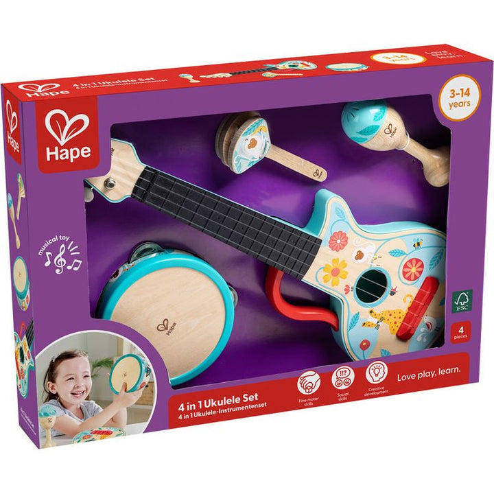 Start your very own band with the bright and vibrant ukulele set. You can invite your friends and family to play your favourite tunes with the realistic ukulele, maraca, tambourine and castanet. PERFECT UKULELE PLAYSET: This playset is made of 4 musical instruments: a maraca, castanet, tambourine and a ukulele. HELPS W