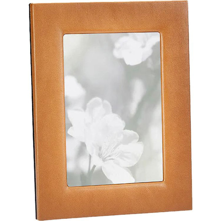 This rich leather frame beautifully accents your favorite photo. Handcrafted frames, wrapped in leather on both sides, with a sturdy metal easel. Convenient rear drop-down door for easy and frequent access to photos. Overall Size: 7" x 9" Opening: 5" x 7" Full grain leather