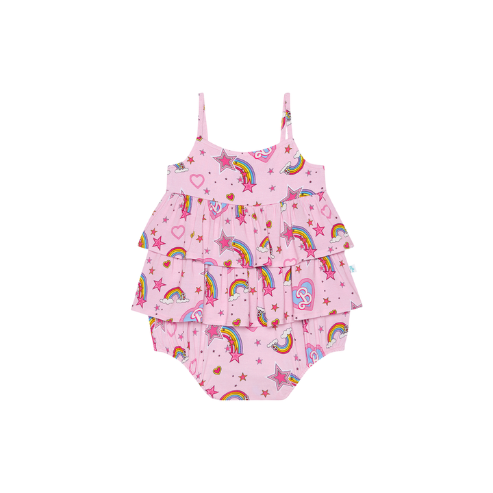 Spaghetti strap bubble rompers are the perfect lightweight summer outfit! Päpook® viscose from bamboo is buttery soft, breathable, and oh so cute! Spaghetti straps, ruffled bodice, and snap closure for an easy diaper change. Sleeveless with a ruffled bodice Inseam snap closure for an easy diaper change Printed ribbed v