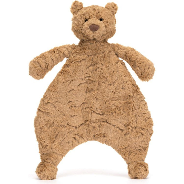 Bartholomew Bear Comforter is the perfect cuddling companion. Shaped like Bartholomew Bear in textured toffee fur created from recycled fibres, little ones can hold on to Bartholomew’s hand, or cuddle into an unstuffed tummy for joyful journeys and soothing sleeps. Tested to and passes the European Safety Standard for