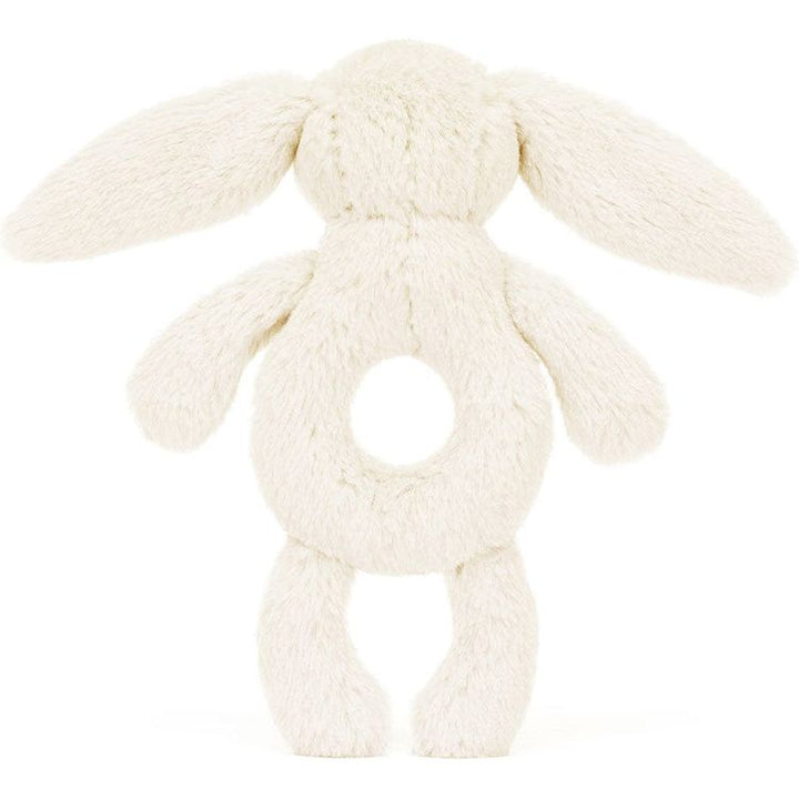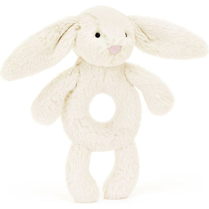 A treat for tiny hands, Bashful Bunny Ring Rattle can be grabbed by its soft paws, long lop ears or ring-shaped tummy. When given a gentle shake it will sound the rattle inside, much to baby’s delight! Crafted in a silver-grey coloured fur made from recycled fibres featuring a Bashful Bunny pink suedette nose and embro