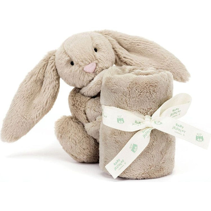 A perfect gift for newborns, the Bashful Bunny Soother is our most loved Bashful Bunny in a soft fur, with long lopped ears, a pink suedette nose and stitched eye detail holding a square shaped soother, un-stuffed and irresistibly soft to touch. Made from recycled fibers and neatly rolled up and presented with a Baby J