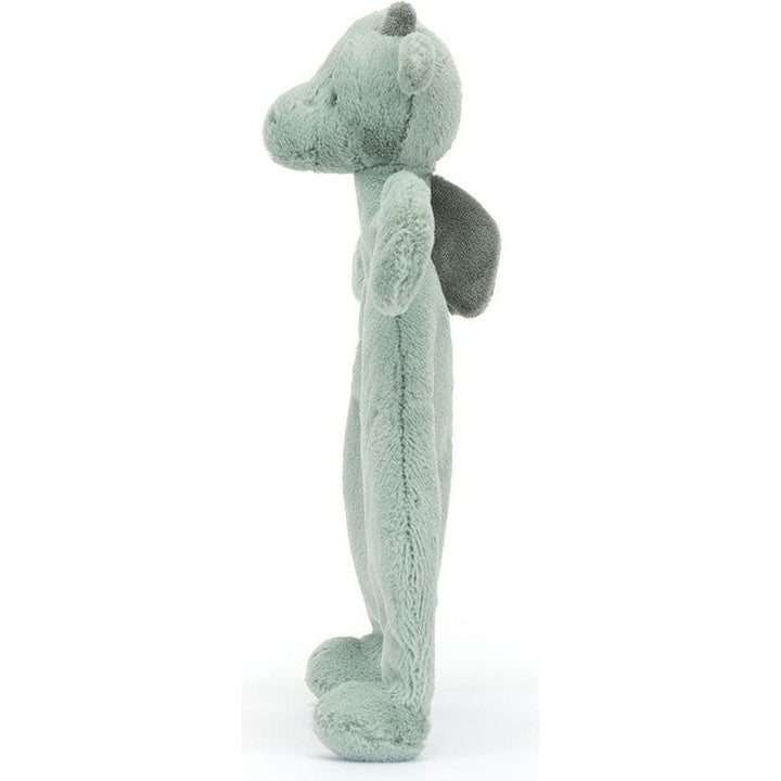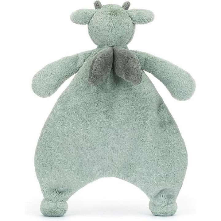 Introducing the Bashful Dragon Comforter, soft in a mossy-green hue and made from recycled fibres. Our most loved dragon companion has suedette wings and horns and embroidered eyes and nostrils. Designed for little hands to grab its arms and feet and an un-stuffed tummy to cuddle. There is nothing scary or scaly about