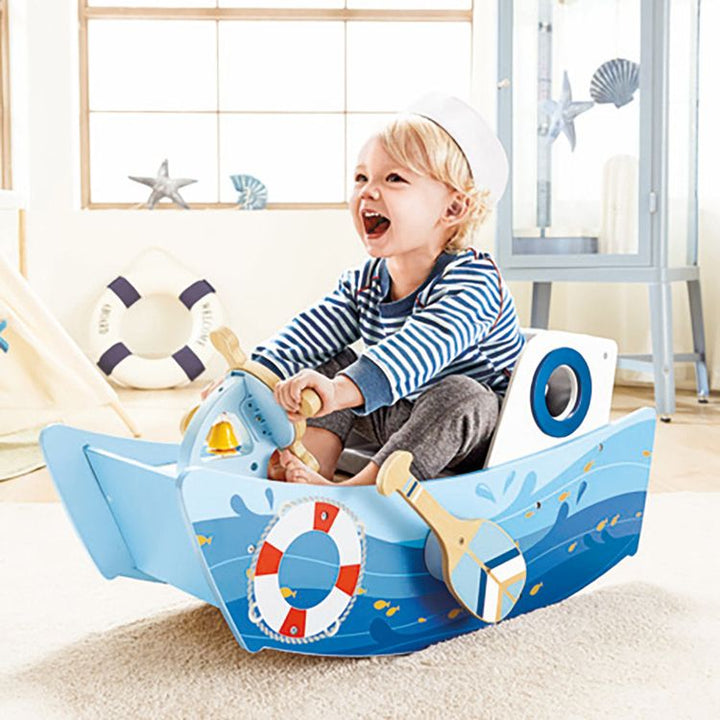Set sail on endless imaginative adventures with our interactive toy boat. Features oars, a steering wheel, and a hook for a captivating playtime experience. SUPPORTS THEIR MOTOR SKILLS: By rowing and steering, children can develop their fine and gross motor skills. REALISTIC SOUNDS: When you turn the steering wheel, it
