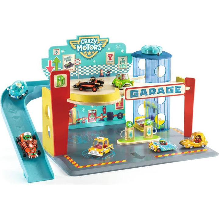 Start your engines for whimsical imaginative adventures! This gorgeously designed wooden garage is a gift that wows! Bursting with charm, it's equipped with exciting features: a lift that raises cars to the top level, a ramp for a thrilling exit, colorful storytelling illustrations, and detachable accessories like roll