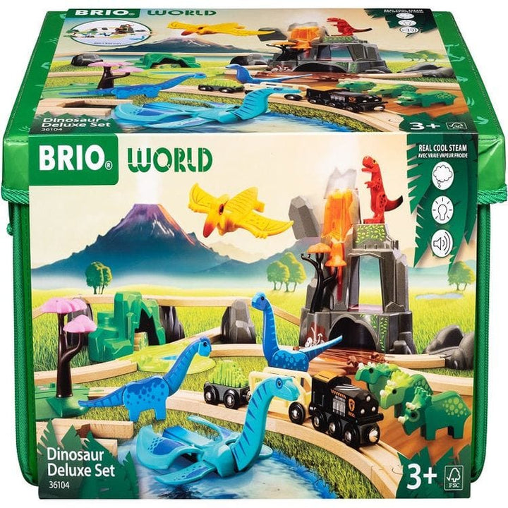 Explore the world of dinosaurs in the Dinosaur Deluxe Set. This 44-piece train set is a Jurassic-jungle of fun and storytelling, complete with a volcano that erupts with lights, sounds and realistic steam-effects. Join 8 playful dinosaurs that come in a variety of vibrant colours and offer unique functions like movable