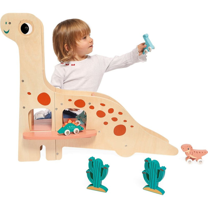 VRRRoom! Back to the pit for the T-rex! Here is a magnificent garage in the shape of a diplodocus. The 4 rolling dinosaurs can go off for a jaunt and come back to the garage to rest… The garage is equipped with a lift allowing direct access to the first and second floors. To get back down? There are two possibilities