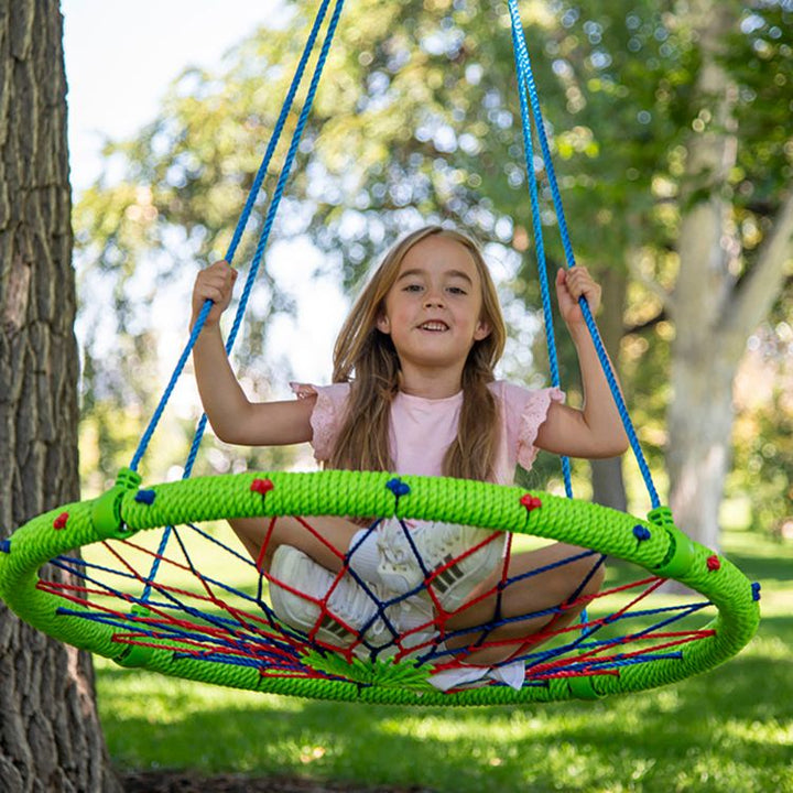 An attractive colorful woven dreamcatcher pattern creates an enticing swing for both kids and adults! Simple snap together assembly. Made with a core steel ring, heavy-duty adjustable PE UV-resistant ropes, and hanging carabiners. Maximum Weight Recommendation: 500 Pounds Product dimensions: 100"D x 100"W x 6"H Ages 3+