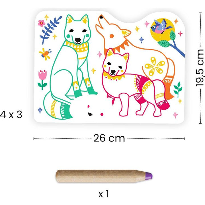 A pocket with 12 pictures to be colored in using a jumbo colored pencil, perfect for little ones. Color in the animal families using the pencil to reveal what’s hidden. It’s magic: the pencil only marks certain areas, uncovering patterns and revealing surprises! Magic effect: the pencil only marks the predetermined are