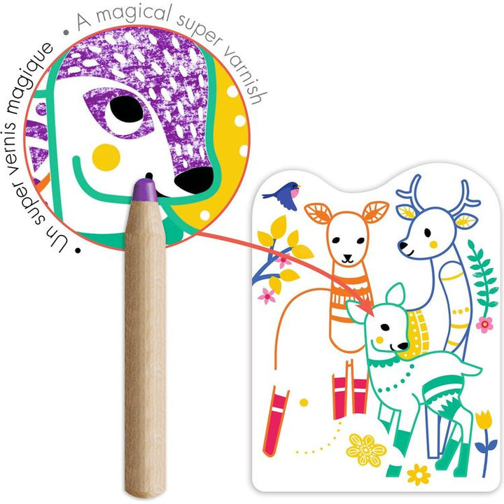 A pocket with 12 pictures to be colored in using a jumbo colored pencil, perfect for little ones. Color in the animal families using the pencil to reveal what’s hidden. It’s magic: the pencil only marks certain areas, uncovering patterns and revealing surprises! Magic effect: the pencil only marks the predetermined are