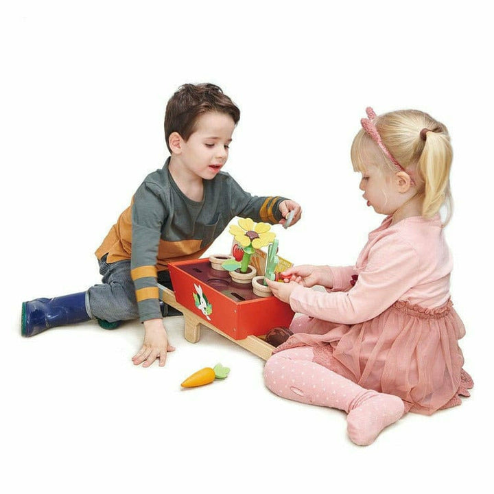 For all the budding gardeners out there…a sturdy solid wood wheelbarrow complete with 3 seed packets, 3 flower pots with a sunflower, carrot and tomato plant. Water the plants with a watering can, tend with a trowel and cut the flower with the birdy secateurs. Ages: 3 Years + Product size: 19.09 x 6.89 x 12.2” Weight: