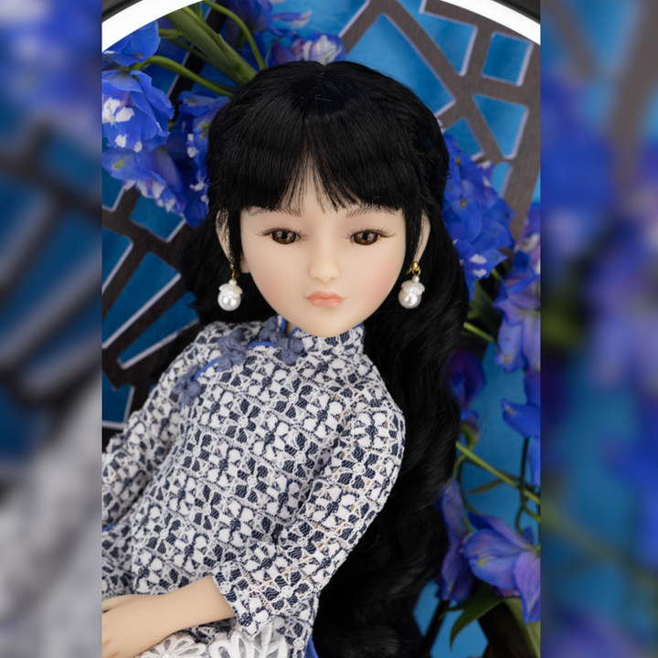 Kiki has on a stunning two-tone textured qipao-style top, with a chic mandarin collar. Adorned with delightful white floral and bead embellishments, this top is a true showstopper! Underneath, she rocks a fabulous blue and white halter dress, flowing gracefully with a pleated bottom that dances with every step. To comp