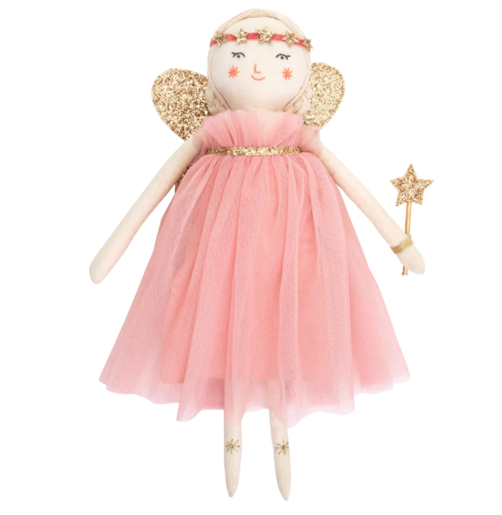 Freya fairy doll will make a most wonderful gift and is perfect for hours of imaginative play. She’s beautifully crafted from cotton and has sweet stitched features and gorgeous gold fleck white yarn hair. She’s dressed in a pretty pink tulle dress with glittery fabric fairy wings. a shimmering star headband and a sparkly wand.