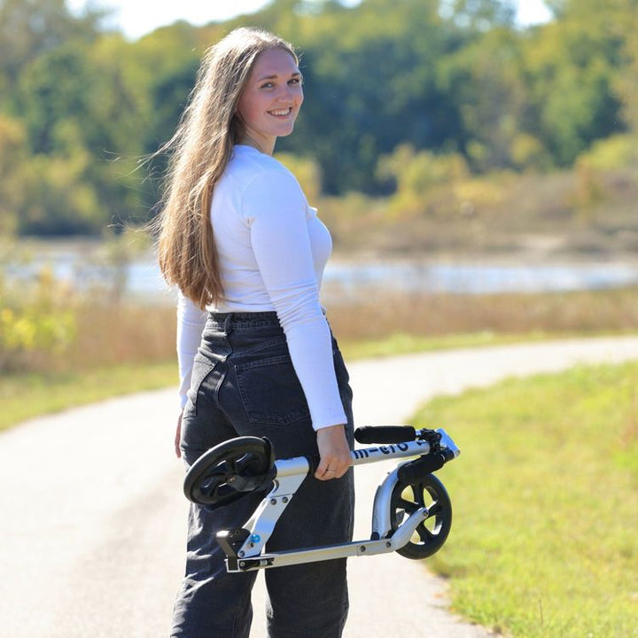 The Micro Classic is our best-selling scooter for adults and teens. Loved for its super-smooth, almost effortless glide and sturdy construction, this scooter offers a classic style – you’ll look and feel elegant when you ride! Plus, it now comes in a sleek Matte Silver finish. The deck is situated low-to-the-ground, cr