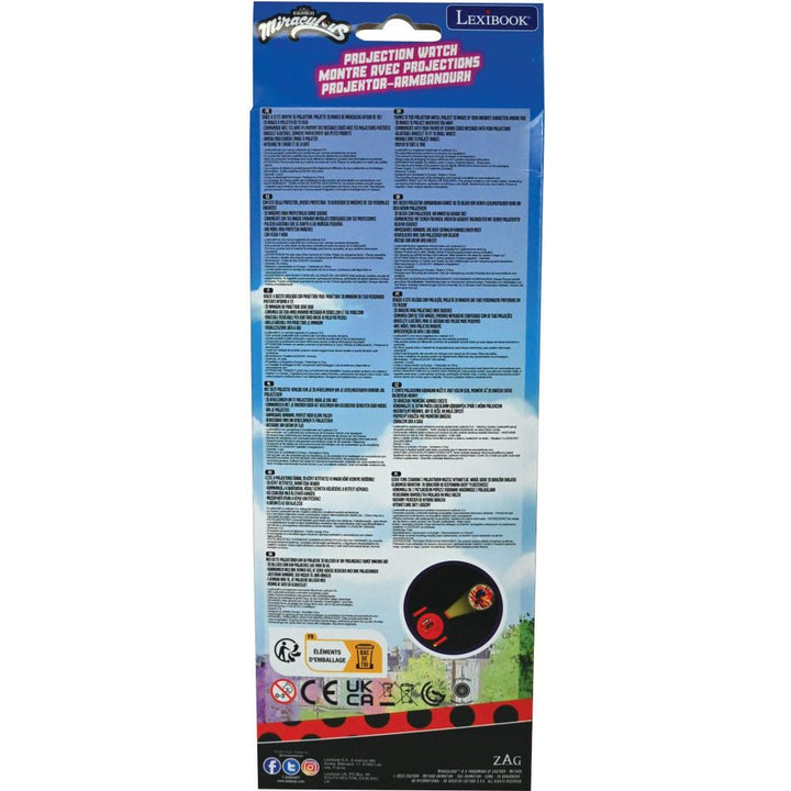 A digital watch with Miraculous design! 20 images of lady bug universe to project wherever you want Communicate with your friends by sending coded messages with your favorite screenings Adjustable strap, perfect for small wrists Rotating ring to choose the image to be projected Time and date display Dimensions: 5.31 x