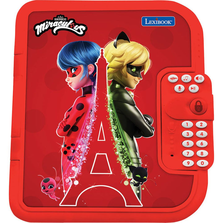 A Miraculous secret safe notebook to write down all your secrets and keep them safe. Create a 4-digit password to unlock the notebook. Fun features: voice recorder, voice changer. Personalise your notebook. A pen included, possibility to change the notebook when you have filled all the pages with your secrets! Dimensio
