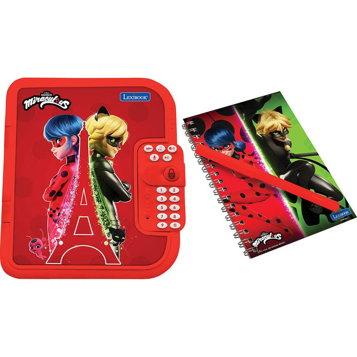 A Miraculous secret safe notebook to write down all your secrets and keep them safe. Create a 4-digit password to unlock the notebook. Fun features: voice recorder, voice changer. Personalise your notebook. A pen included, possibility to change the notebook when you have filled all the pages with your secrets! Dimensio