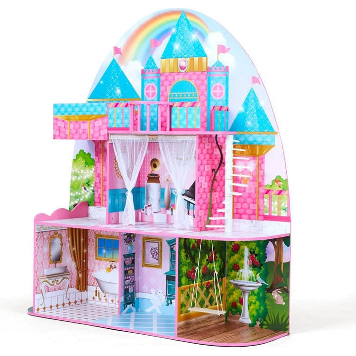 Let your little one’s imagination soar with this enchanting castle-style wooden dollhouse! Two stories tall, the dollhouse features a kitchenette, bathroom, and bedroom for 12" dolls. A spiral staircase leads to the rooftop royal balcony, where the doll can enjoy the view from her throne. Intricate illustrations and in