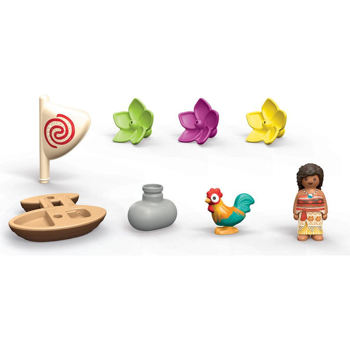 Land Ahoy! The enchanting boat with a cheerful crew on board, inspired by Disney's Moana, sets sail. Moana and the rooster embark on an exciting South Seas adventure. But what floats there in the water? Together with Moana, your child will have fun exploring the water. The colorful flowers can be collected and stacked