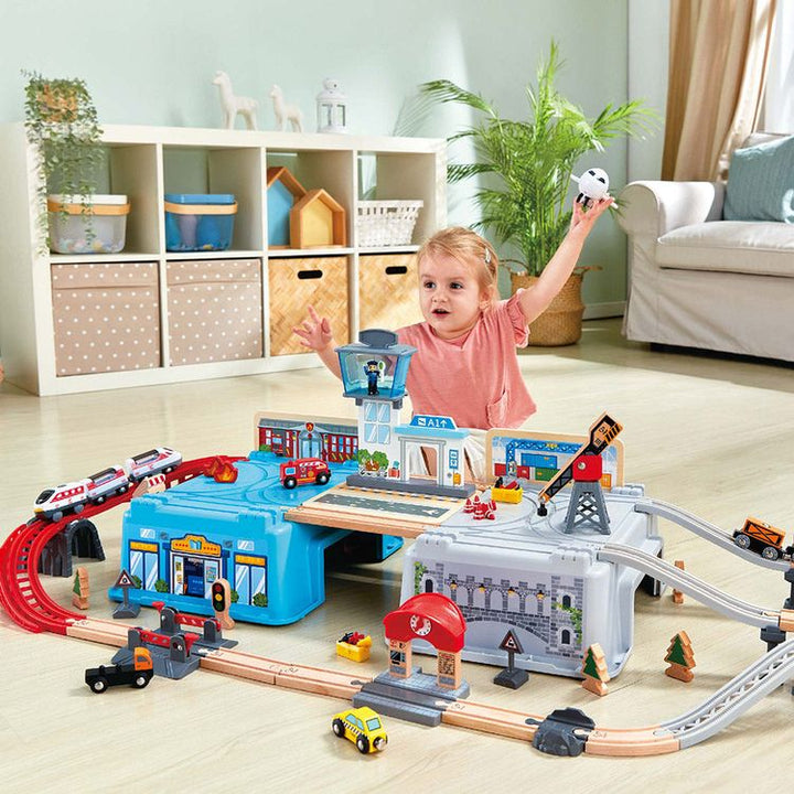 All aboard! With this colorful wooden train set, your little one will role-play as a conductor, an engineer, or a passenger for hours. The battery-powered locomotive has a working headlight and goes forward and backward – but that’s just part of the urban fun. The train station, shops, construction site, airport and op