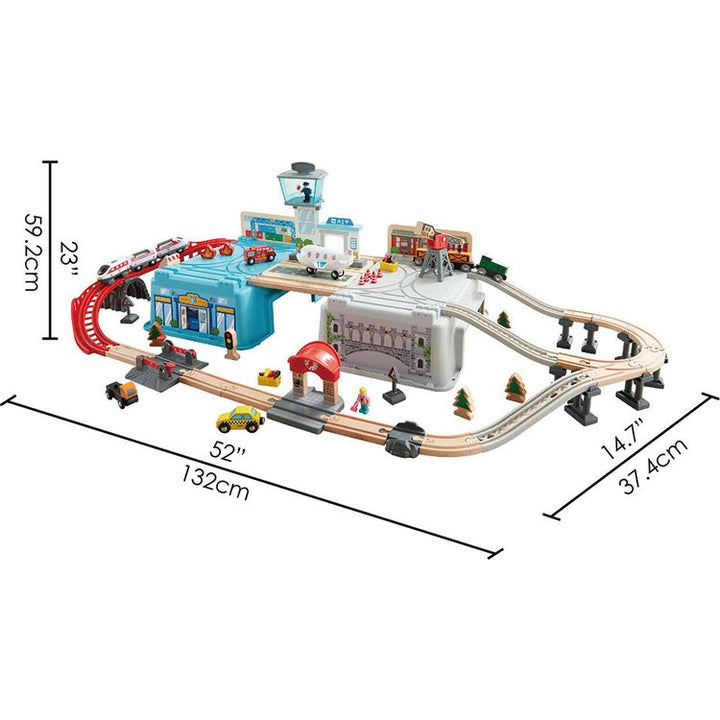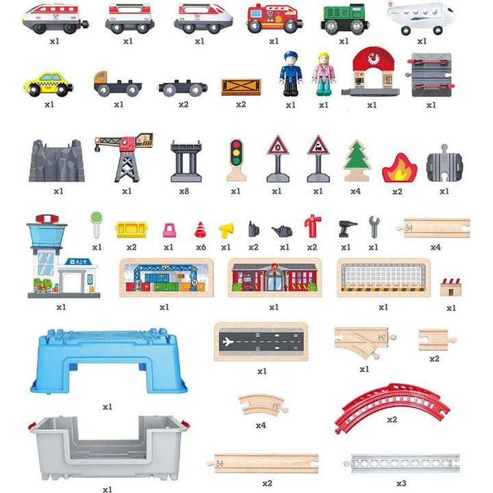 All aboard! With this colorful wooden train set, your little one will role-play as a conductor, an engineer, or a passenger for hours. The battery-powered locomotive has a working headlight and goes forward and backward – but that’s just part of the urban fun. The train station, shops, construction site, airport and op