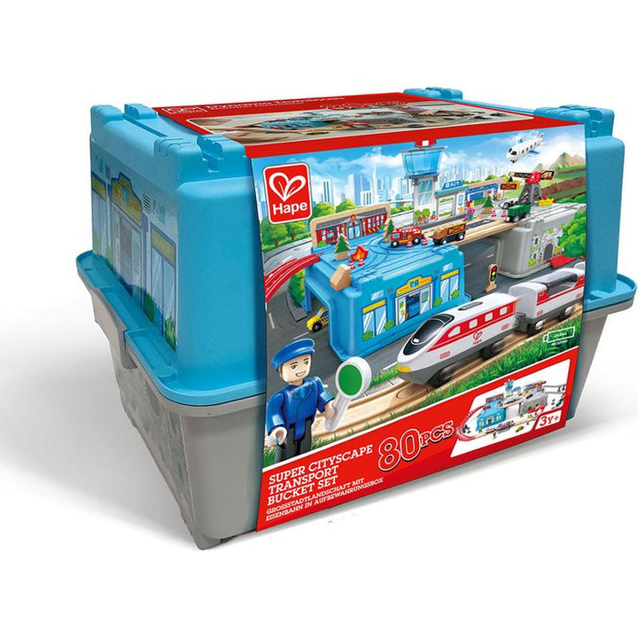 All aboard! With this colorful wooden train set, your little one will role-play as a conductor, an engineer, or a passenger for hours. The battery-powered locomotive has a working headlight and goes forward and backward – but that’s just part of the urban fun. The train station, shops, construction site, airport and op