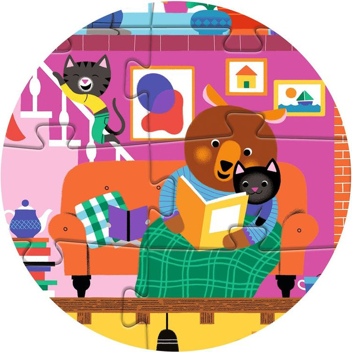 Welcome to the little friends’ house! Have fun cooking, doing DIY, gardening, singing in the bath, reading, and more. A giant, comfy house filled with surprises and joyful scenes. An oversized shaped puzzle. Large, easy-grip pieces. Model card included to help you piece the puzzle together. A puzzle made of thick card