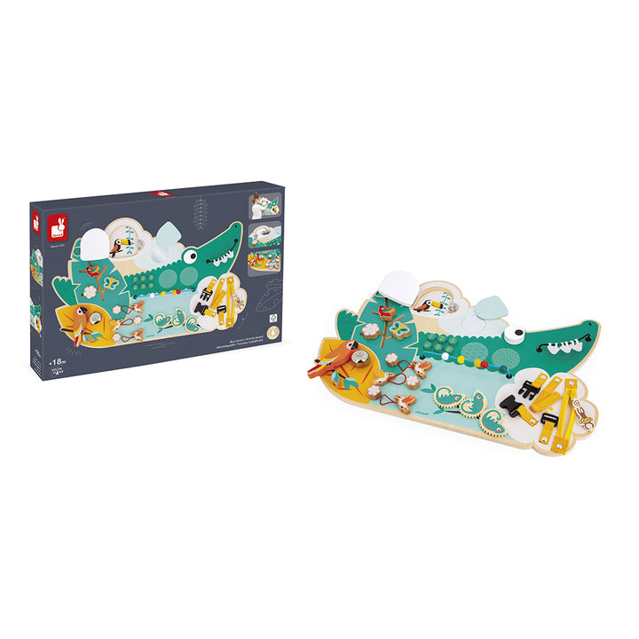 Hidden in the middle of the jungle, Croco is just waiting for your child to come and play and discover more than 14 activities! This comprehensive toy includes: a maze to manipulate, a rotating eye with sound, 3 straps with different fastening systems, chameleon gears, a bell, a metal lock, a hidden mirror, an abacus w