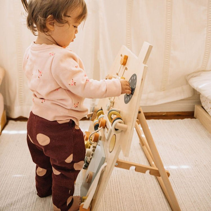 Keep baby busy with our plywood and solid wood Busy Board! 12 Super fun activities to help junior develop small motor skills and color recognition. They will be delighted by sound and tactile stimulation. Activities include maze, clock with moving hands, abacus, spinning toys, key that fits into the door with a surpr