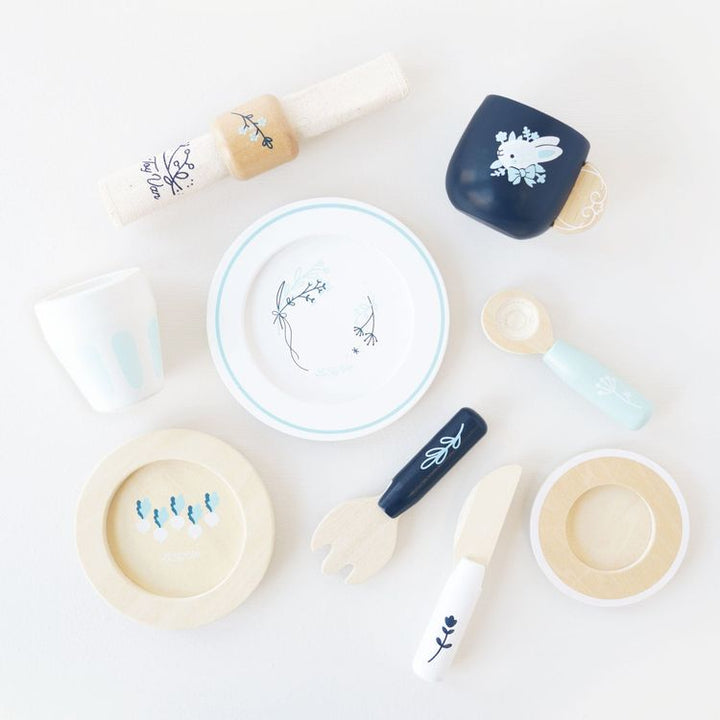 Dinner is served with our stylish wooden cutlery dining set, a wonderful gender neutral toy that's full of fun, sustainable and made to last. Painted in blue and white tones and decorated with pretty botanical illustrations, this cute roleplay toy features a full place setting including mug, coaster, cup, 2 plates, kni